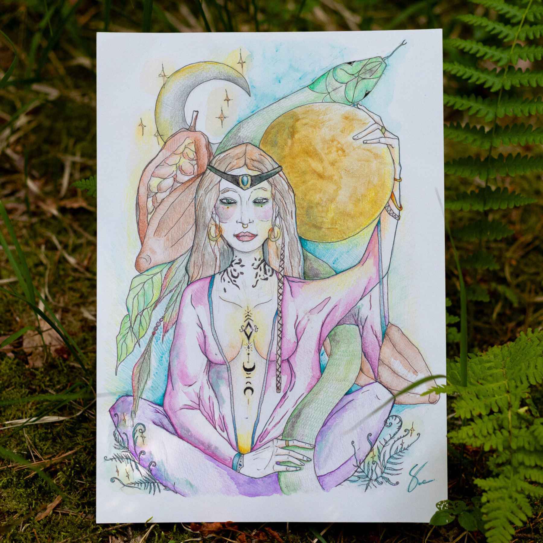 Boginjo je za vas naslikala Anna Pastuszko. Portret je nastal intuitivno, z uporabo svinčnika in vodnih barv. Anno lahko najdeš na Instagramu: SKADI ANNANDI in na Facebooku: Anna Pastuško